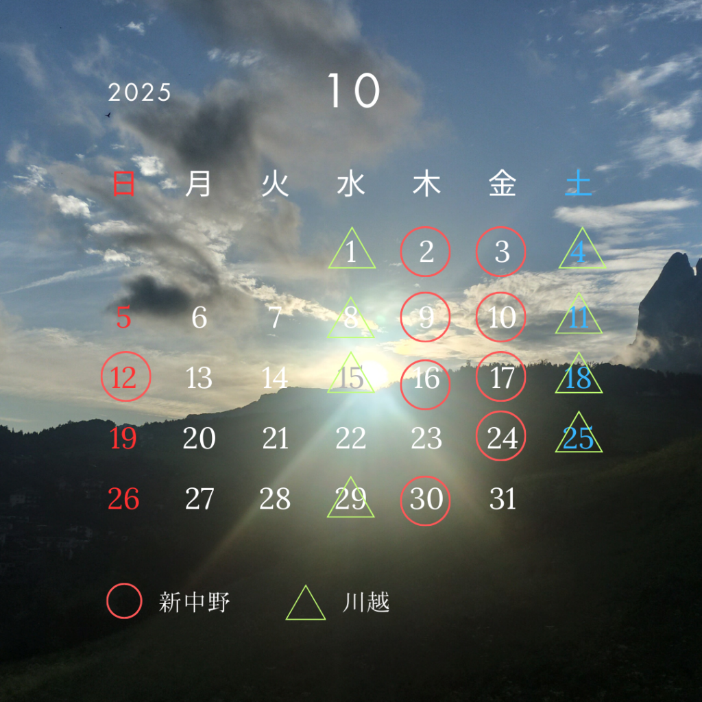 10月の営業案内 2025.09.24 オステオパシー, 川越, 新中野 10月の営業案内になります。 木金は新中野・水土が川越での施術になります。 よろしくお願いします。 オステオパシー, 川越, 新中野 8月の営業案内前の記事